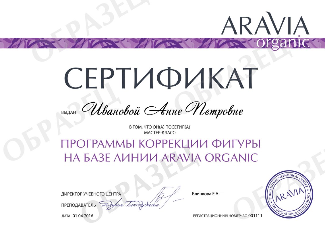Хочу выразить благодарность Давыдовой Марине,Санкт-Петербург за проведенный семинар 13.06.19 г. Aravia organic Программы коррекции фигуры на базе линии Aravia organic.Сама посещаю семинары и делаю закупки продукции и рекомендую коллегам.